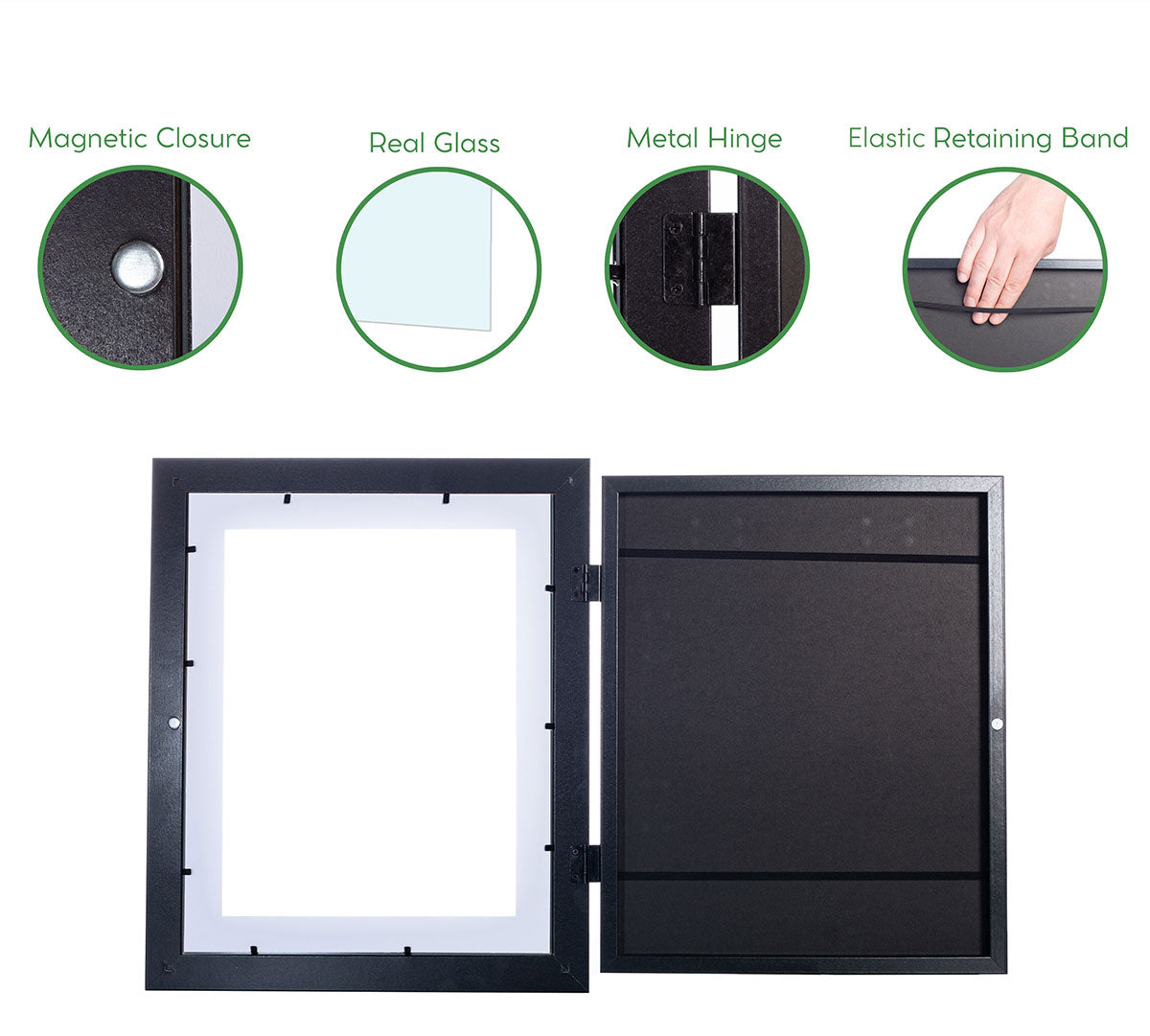 - Sturdy Frames – Sturdy front loading wooden frame with 1 1/8" wide molding and magnetic closure, with an inside depth of 0.5". Great for multiple pieces inside or 3D artwork.