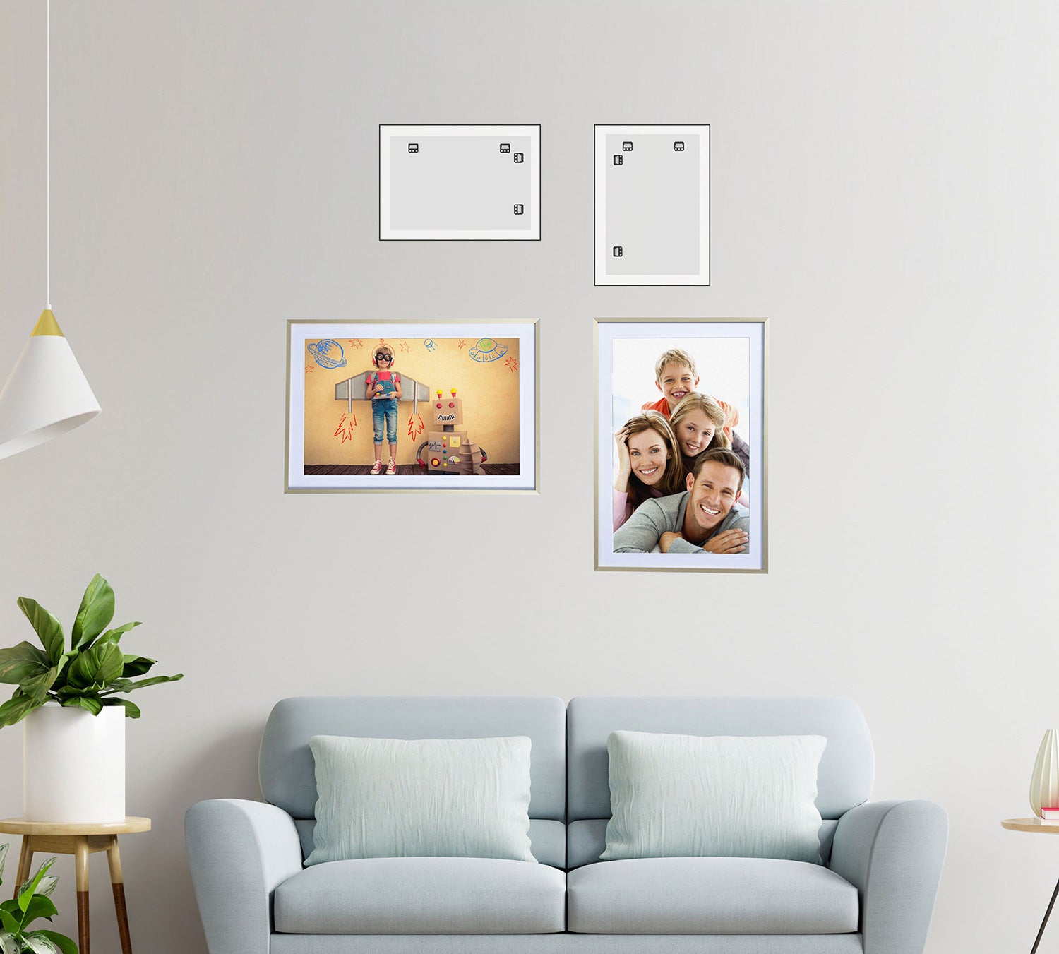 - VERSATILE – Designed with multiple sawtooth hangers for your choice in vertical and horizontal hanging on your wall. The 4” x 6”, 5” x 7”, and 8” x 10” frames have a back panel and sturdy easel for placement on any flat surface such as a desk, table, shelf, nightstand, or countertop; the 11” x 14” frames and larger do not.
